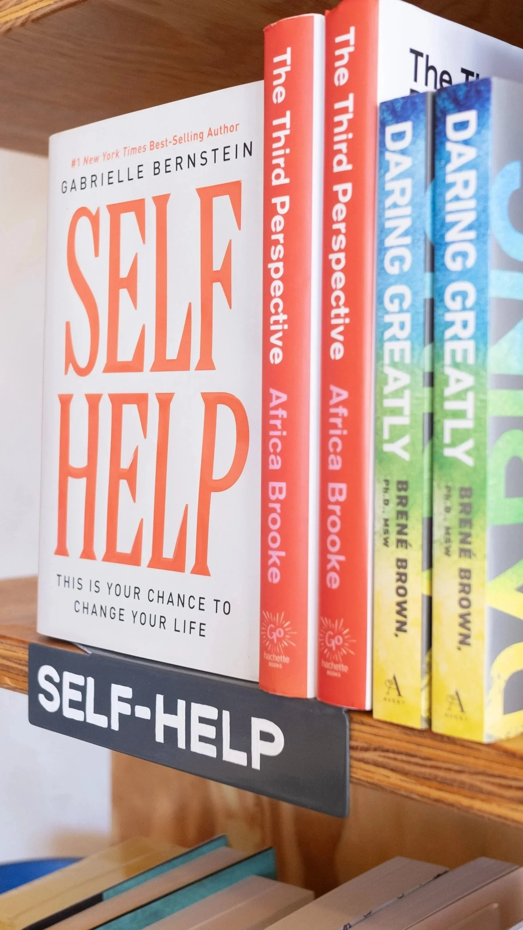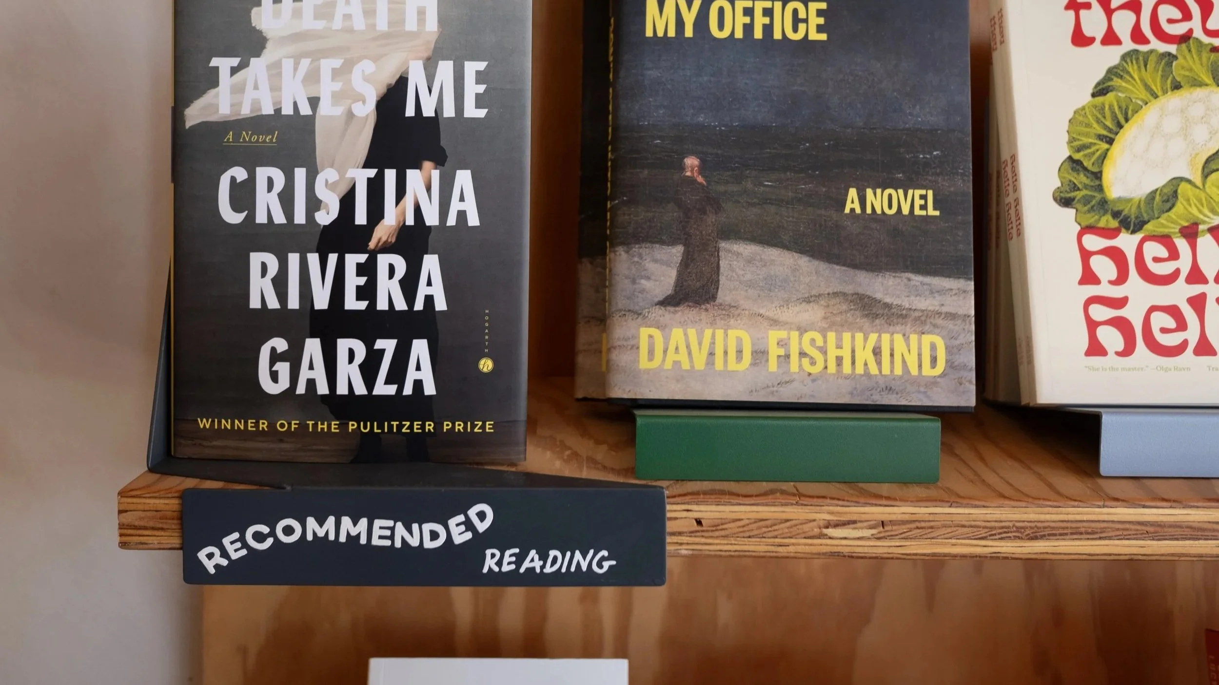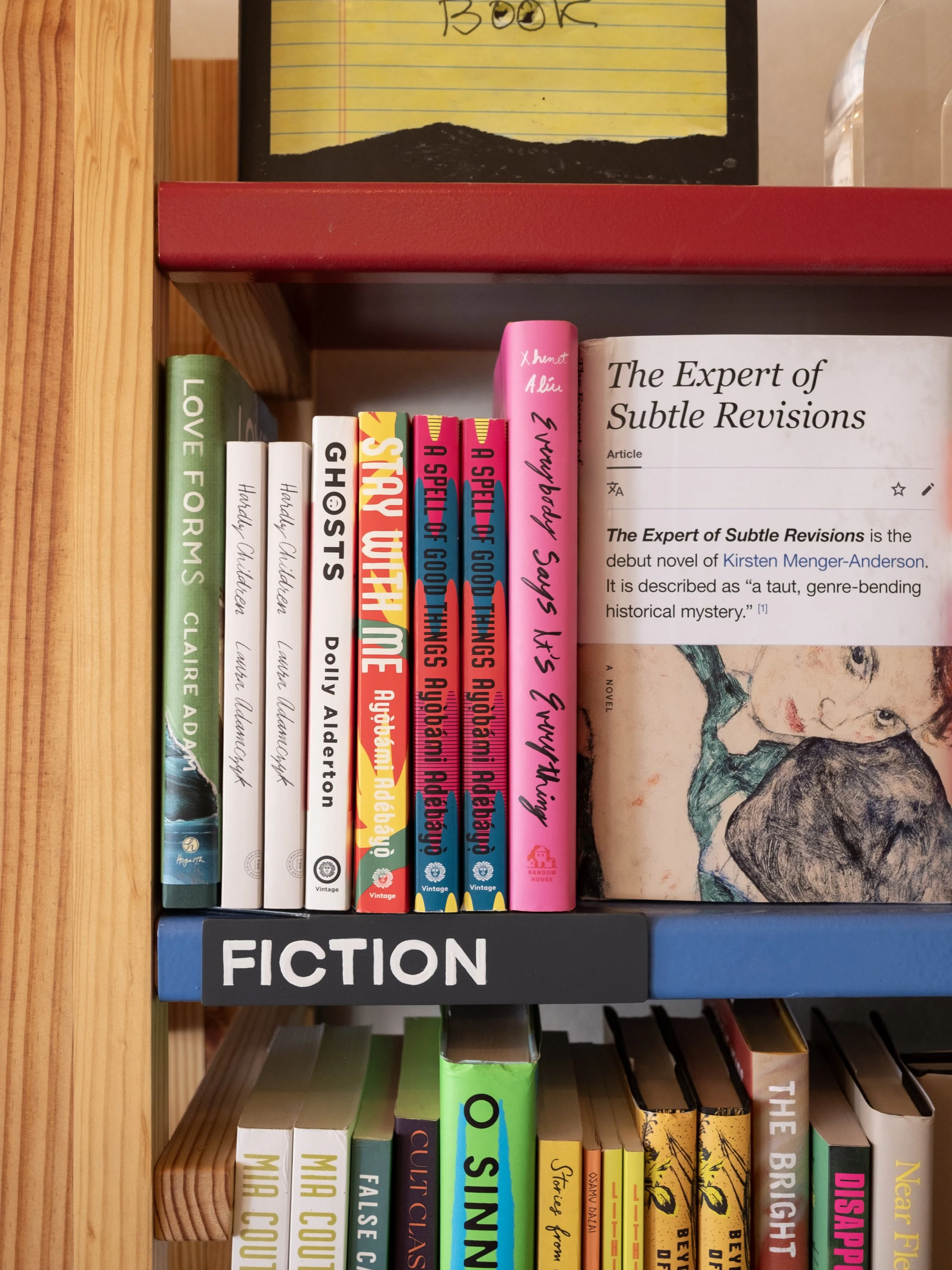 Hand-lettered shelf ‘talkers’ show off the many genres available throughout the downtown book store.